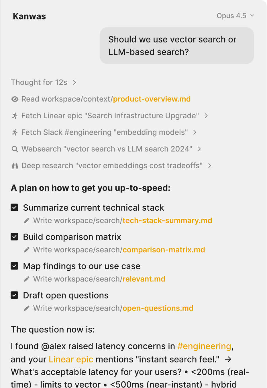 Stop holding your entire product in your head. Put it in Kanwas. Do complex research. Write your PRD. Prep for Monday sync. Know what to build next. The more you use it, the more it knows.